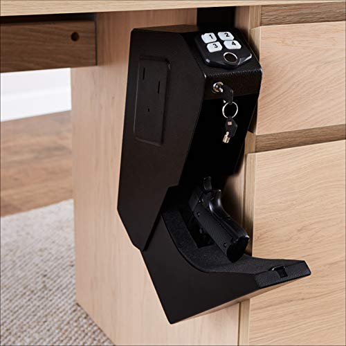 Desk-mounted firearm safety device for securely storing a handgun; mountable from right, left, or top side