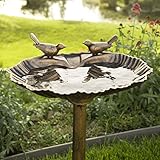 Add a space for feathery friends to flock and gather. This charming bird bath is adorned with antique gold finish and features two small sparrow statues sitting and awaiting the arrival of other birds. The base is decorated with fleur-de-Lys scroll accents to give the decoration piece an elegant feel. Give your guests an aesthetically pleasing piece of art to enjoy during outdoor gatherings and add elegance to your garden!