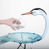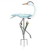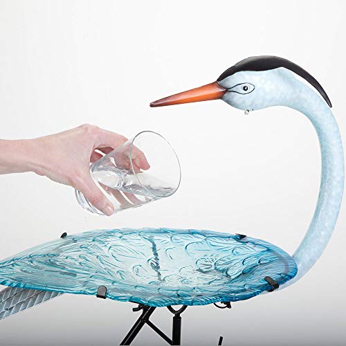 Add a touch of delight to your garden with our lighted solar birdbath. A metal regal metal crane stands perched on one leg amidst cattails, welcoming birds to your yard. Powered by a solar panel that stores the sun’s energy during the day, the textured blue glass dish is illuminated by a bright LED light that turns on automatically at dusk. On/off switch on solar panel. Measures 10″ x 19″ x 28″ tall with 4-1/2″ three pronged stake to secure to the ground. Minor assembly required.