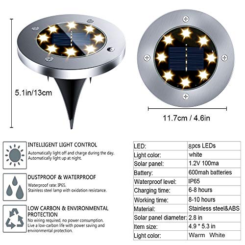 Solar Ground Lights – 8 LED Solar Garden Lights Outdoor Waterproof Sidewalk Disk Lights Solar Powered Landscape Lighting for Lawn Patio Pathway Yard Deck Walkway Flood Lights- Warm White